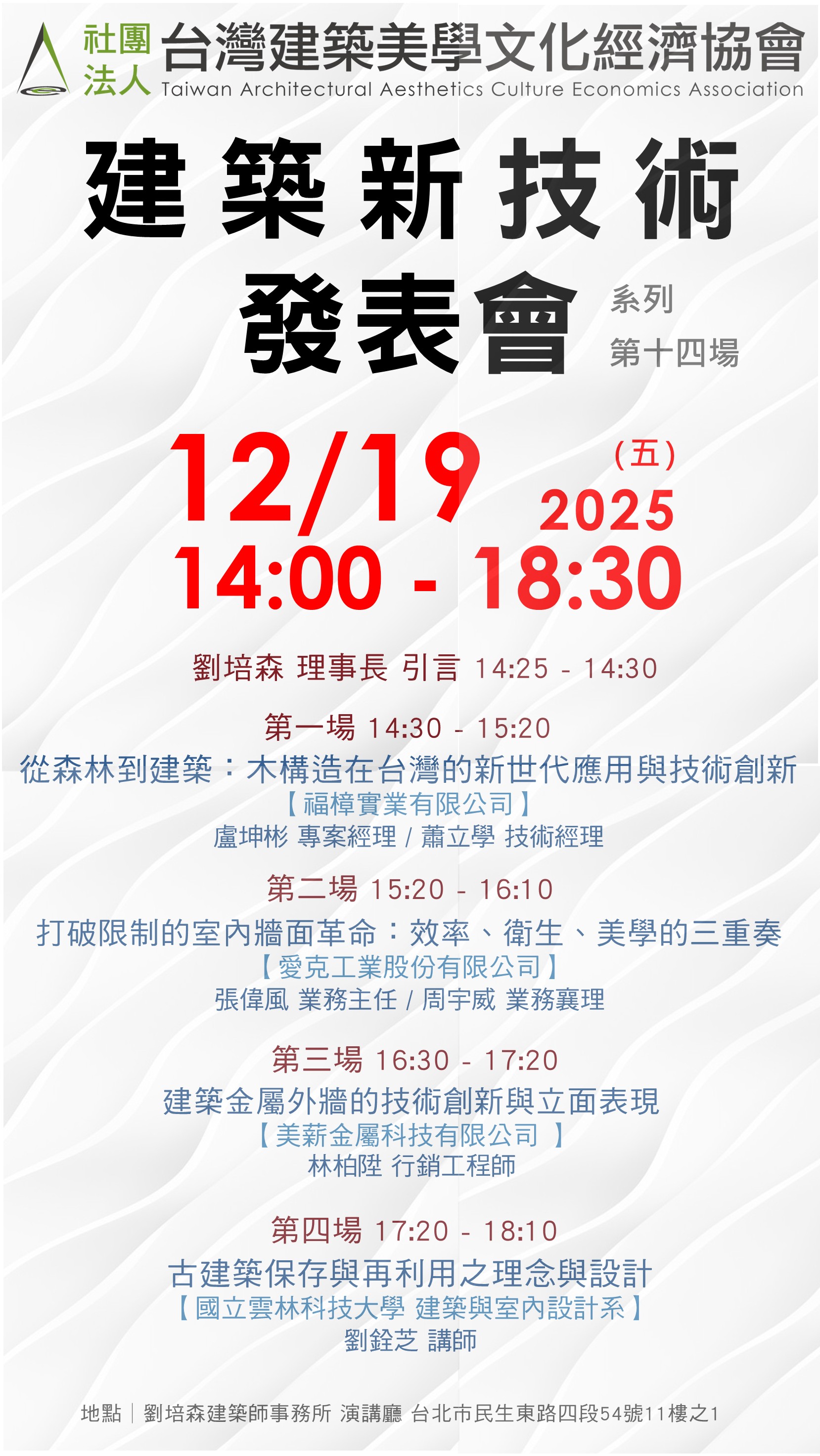 .日期:2025.12.19(五) 14:00-18:30(14:00-14:20為報到時間)